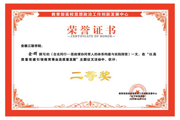 近日,教育部高校思想政治工作创新发展中心(辽宁财贸学院)发布“以高质量党建引领教育事业高质量发展”主题征文活动评选结果,马院报送的案例《合光同行——思政课协同育人的体系构建与实践探索》获评二等奖,充分彰显了学校在推动深化新时代思想政治理论课改革创新方面的系统思考和扎实成效。